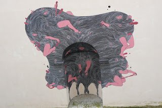 The enormous black and white work behind me in the second photo is by famous Italian graffiti artists (talented ones) Sten & Lex. I have attached a video to try to express the uniqueness of their craft.