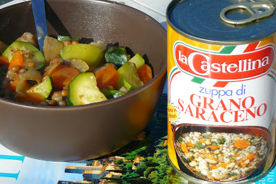 Our favorite at-home lunch is store bought "buckwheat" soup, accentuated with fresh carrots, zucchini and onions.  It's our Italian comfort food!