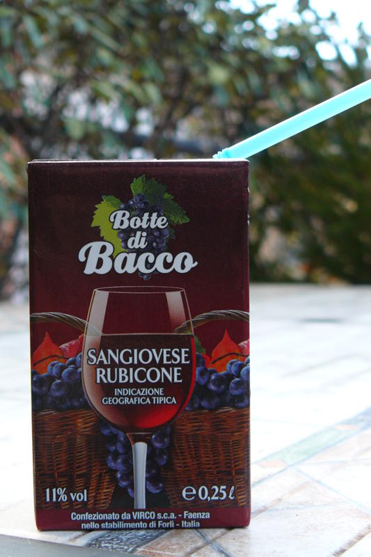 While shopping today, we found Botte di Bacco (barrel of Bacchus) and thought of all the years we had juice boxes at home for the kids. Leave it to the Italians to cater to adults' needs by creating a three pack, 1/4 liter each box, of pretty good red wine.