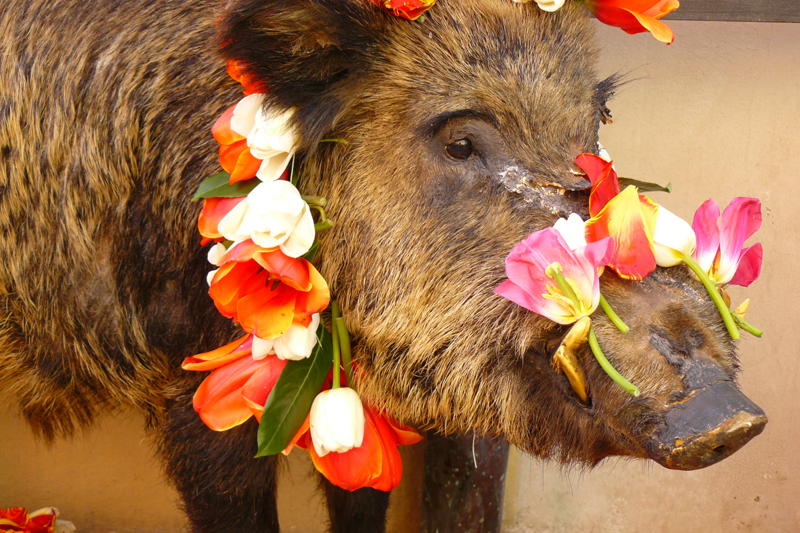 We arrived early to find street theaters, buskers, folk dance groups, brass bands, processions and games of the "Nobles" and the "Common people" in historical costumes (a true Renaissance Faire). Yesterday, the festival culminated in a big procession with flower decorated carts, displaying allegorical as well as satirical themes. Each cart represented one of the "rioni", the quarters of the town, displaying the quarter´s colors. The carts were covered in literally thousands of tulip flowers (usually the ones to short to be sold), arranged painstakingly to artistic compositions.