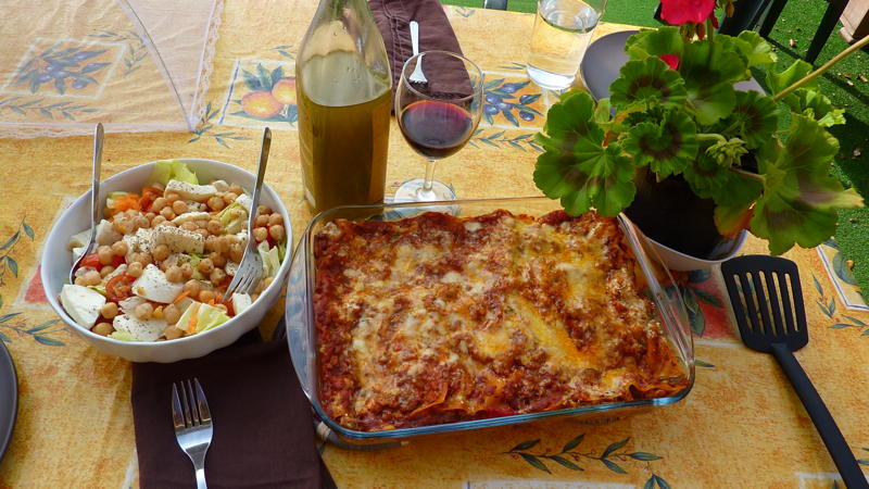 My favorite entrée to make here is a wonderful lasagne. Steve likes it because it is not a food item one finds often in Umbrian restaurants (interestingly, the term "lasagna" comes from the Greek word, "lasagnum," meaning dish or bowl. The ancient Greeks used baking dishes of that name, which they eventually transferred to the Romans).