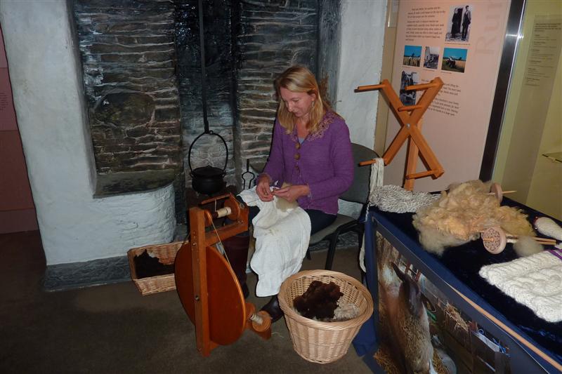 | We have learned so much from the people we've met in various places. Yesterday, while at the Clare Museum in Ennis, we met Nelli, a woman who was pretty amazing. She and her husband bought a house here in Ireland and got a few sheep for 'lawn care'. Since there were only a few sheep, no one would come to their farm to shear them, remembering seeing it done when she was a child, she grabbed some shearing scissors and gathered wool the old fashioned way. This lead to a spinning wheel, combined with her childhood lessons in knitting, all led to her current business and fascination with knitting "from scratch". |