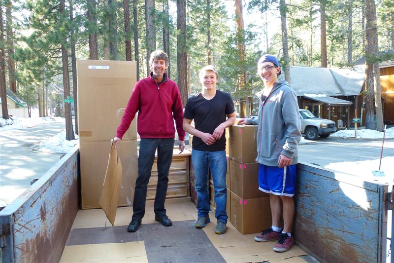 On a gorgeous Spring-like day, we moved into our little cabin in Tahoe. After driving for ten hours, we were met by Jason and Joe, two students our realtor wrangled to help us. In less than one hour, the truck, trailer and my car were unloaded.