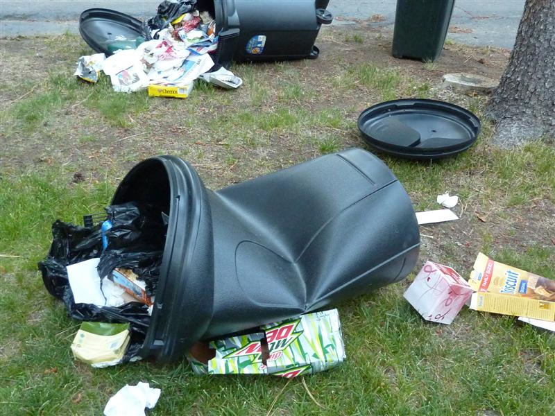 So much for "critter proof" trash cans. This morning our garbage, and most in our neighborhood, was scavenged by a bear. Interestingly, I have a difficult time getting the locking lids off these cans so I am rather impressed by this black bear (there is a huge tooth hole in the lid and can where he opened it). Our neighbor said it happened at midnight and I'm sorry I missed it.